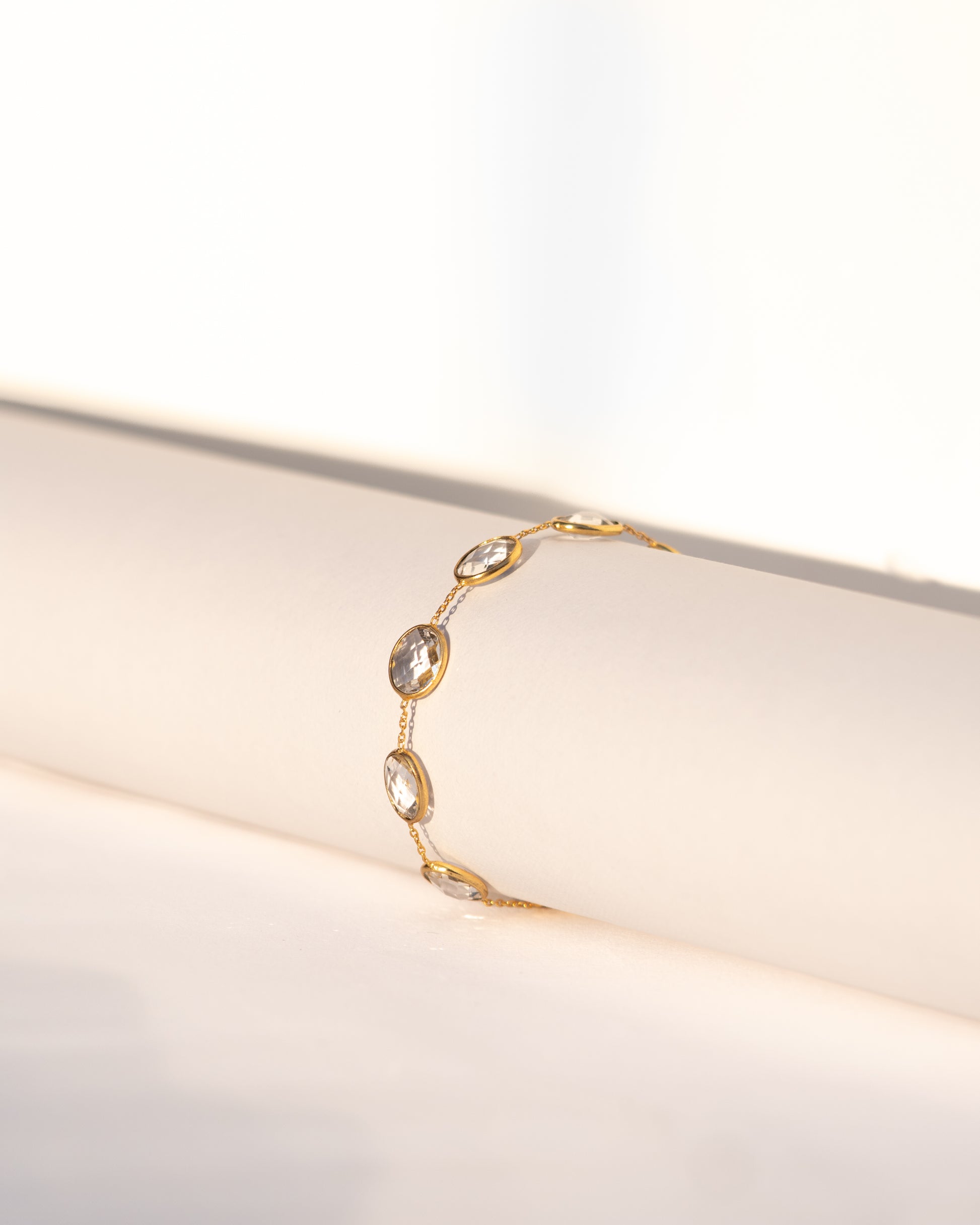 A delicate handmade bracelet featuring natural white topaz gemstones, bezel-set in 18K gold-plated brass. The clear, sparkling stones add subtle elegance to your everyday style.